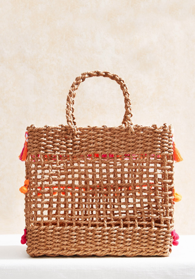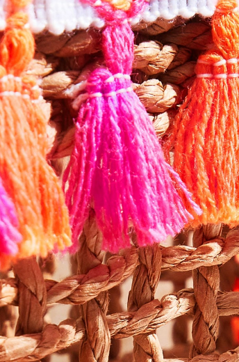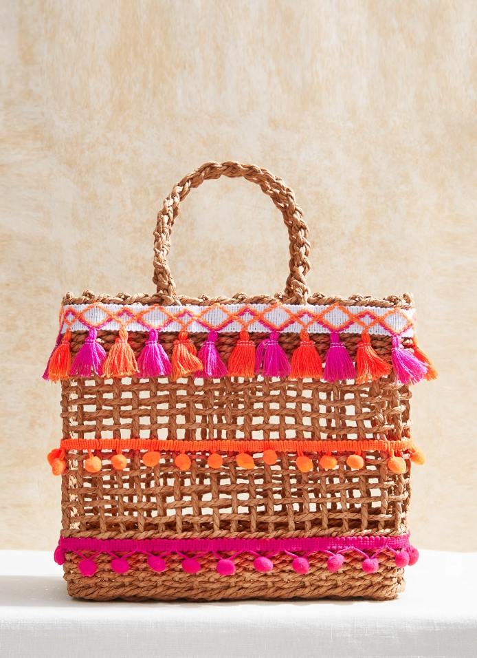 Add a pop of color to your summer look with this handwoven straw tote, featuring bright tassels, playful pom-poms, and sturdy braided handles. Perfect for beach days and sunny strolls!